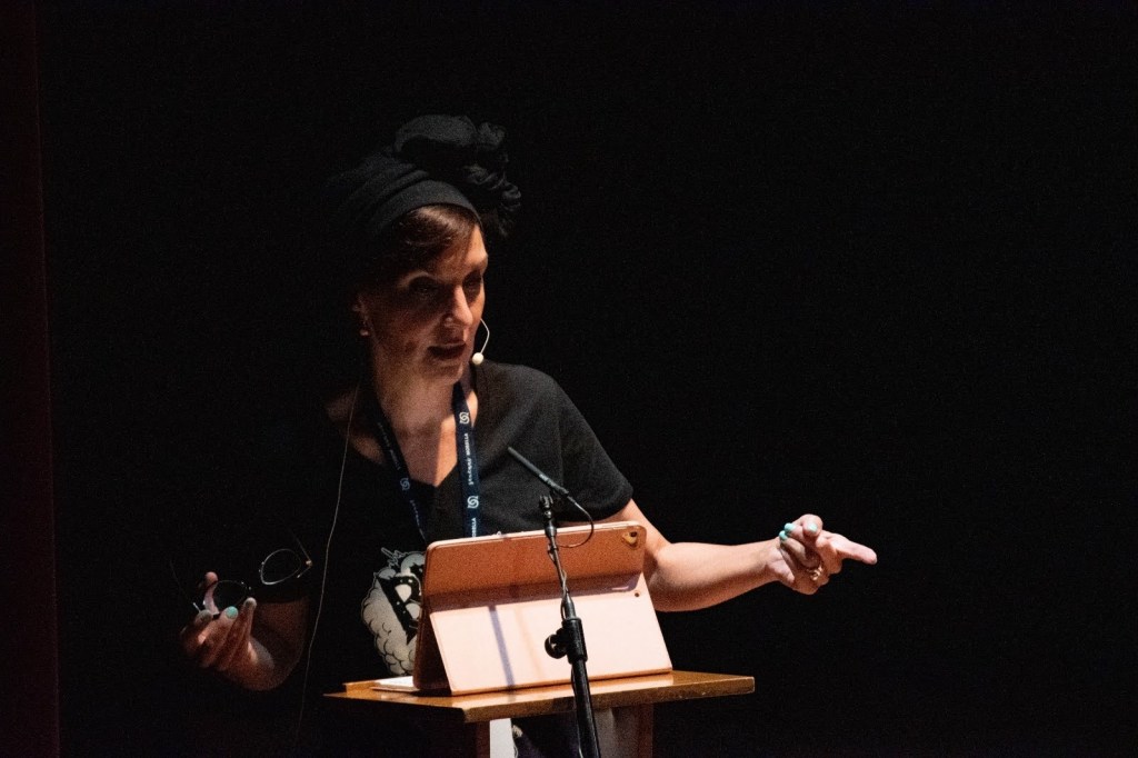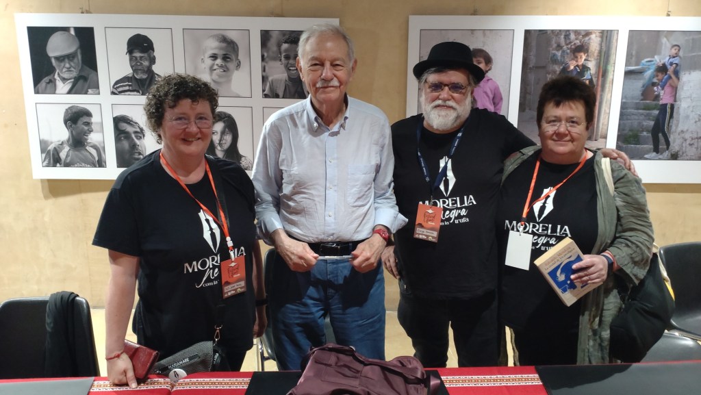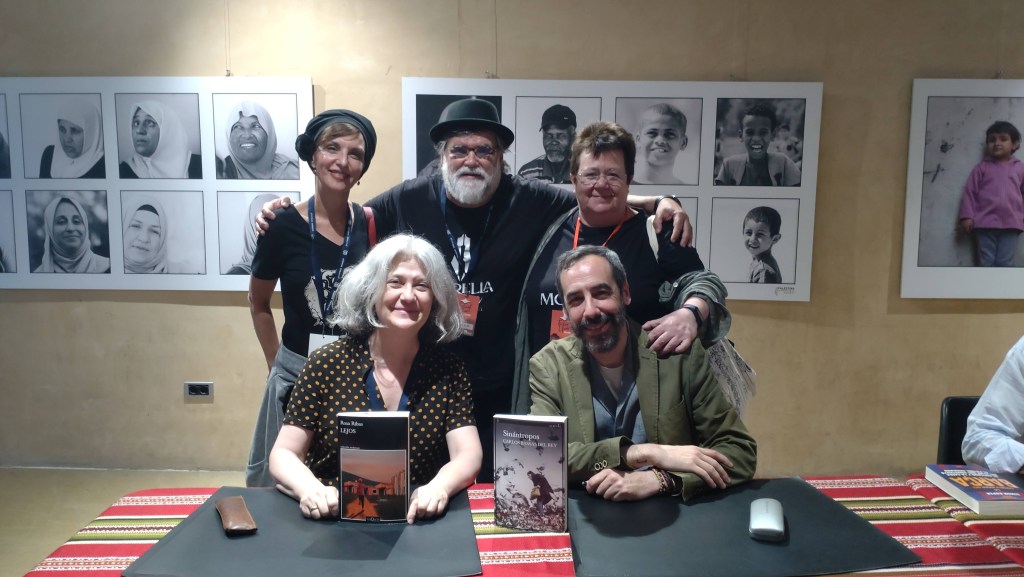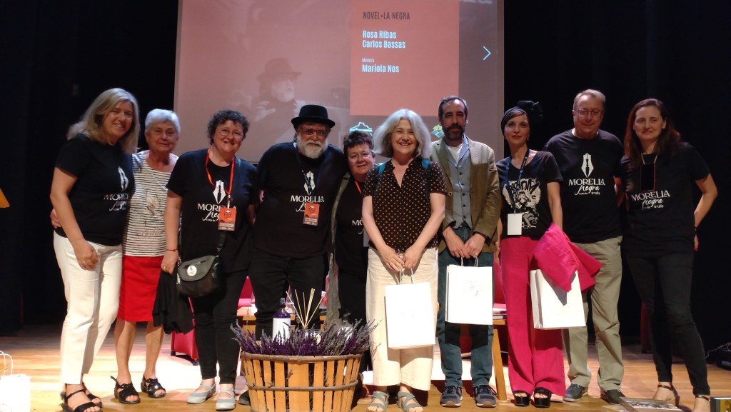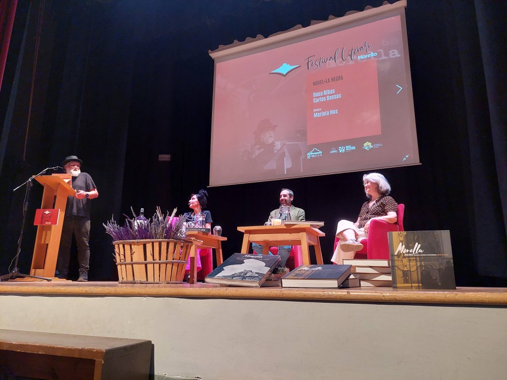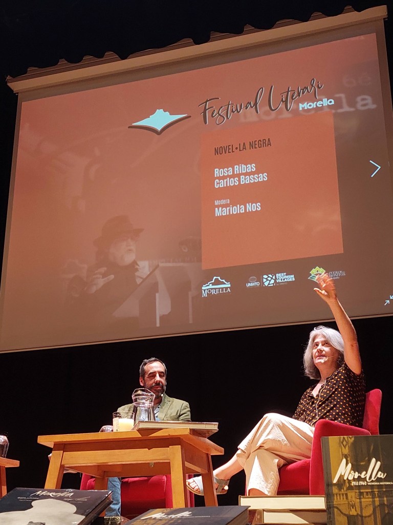 A continuación llegaron las narrativas de La Novela Negra. En recuerdo a Domingo Villar, fallecido recientemente y que participó en la última Morella Negra com la Trufa, se leyeron las palabras que pronunció en el festival reivindicando el placer de la lectura frente al entretenimiento audiovisual: «en las series somos espectadores, la literatura ofrece unas recompensas maravillosas, pero tiene un exigencia grande, para ser lector y vivir la vida prestada que te ofrece un libro tienes que ser espectador, pero también actor, y ser actor exige crear un universo que el escritor ha dejado a medias para que tú lo completes, y esto exige esfuerzo…” “.. tenemos que hacer entender a la gente que viene detrás, que leer es maravilloso, que es vivir una vida prestada, que es vivir..sentir..doler.. enamorarse.. temer por otros… leer no es un esfuerzo baldío”. En el Panel participaron Rosa Ribas que presentaba su novela «Lejos» y Carlos Bassas presentando «Sinántropos» moderados por Mariola Nos. En ambas novelas los protagonistas se encuentran en sendos entornos hostiles, diferentes, casi antagónicos, en los que están atrapados y no pueden escapar. En el inicio inquietante de «Lejos» nos sitúa en una gran urbanización a medio terminar en medio de la nada; mientras que en «Sinántropos» Corto debe regresar a su barrio suburbial después de haberlo tenido que abandonar en su adolescencia, pero todo indica que lo tiende difícil para que las cosas vayan bien. En la conversación se habló de la importancia de la creación de los personajes y el estilo del escritor frente a la trama. Carlos Bassas habló de su obsesión por la corrección, llegando al extremo de que le tengan que quitar el libro de las manos para ser publicado y así evitar corregir hasta el infinito. La diferencia entre los guiones de películas y los libros es que en las películas y series la trama es lo fundamental y en los libros la trama es el alambre donde se sustenta todo lo demás que es lo importante, personajes, etc… Rosa Ribas habló de cómo al crear una novela creas un mundo y en él aparecen personajes secundarios con los que te irías , pero como en la vida no puedes ir detrás de todo el mundo, debes dejar que se escapen y perder esos pedacitos, al final, estos personajes, dan densidad a la novela.