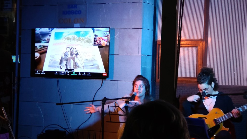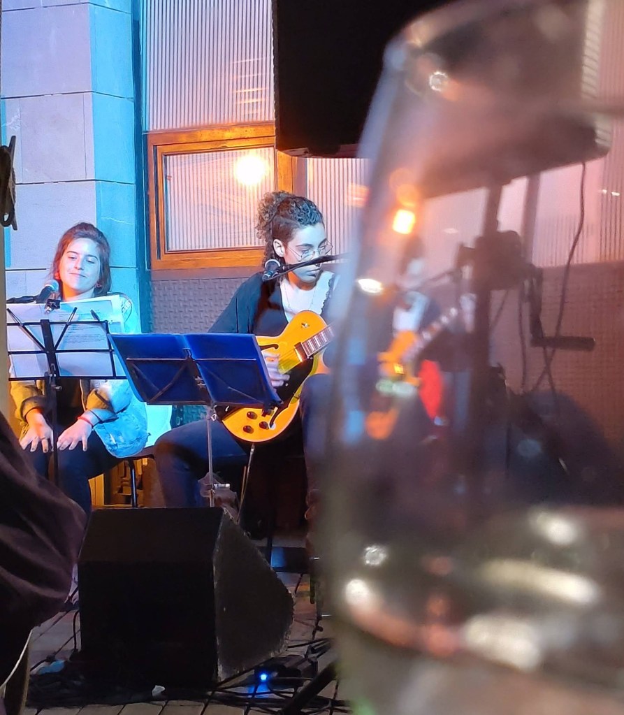 Por la noche «La Disbauxa«nos hizo disfrutar de la noche de primavera con su arte multidisciplinar con creaciones propias y prestadas. La música de Cecilia, los textos y poesía de Teresa y el placer de ver convertir un lienzo en blanco en una acuarela de la mano de Clara en la distancia.