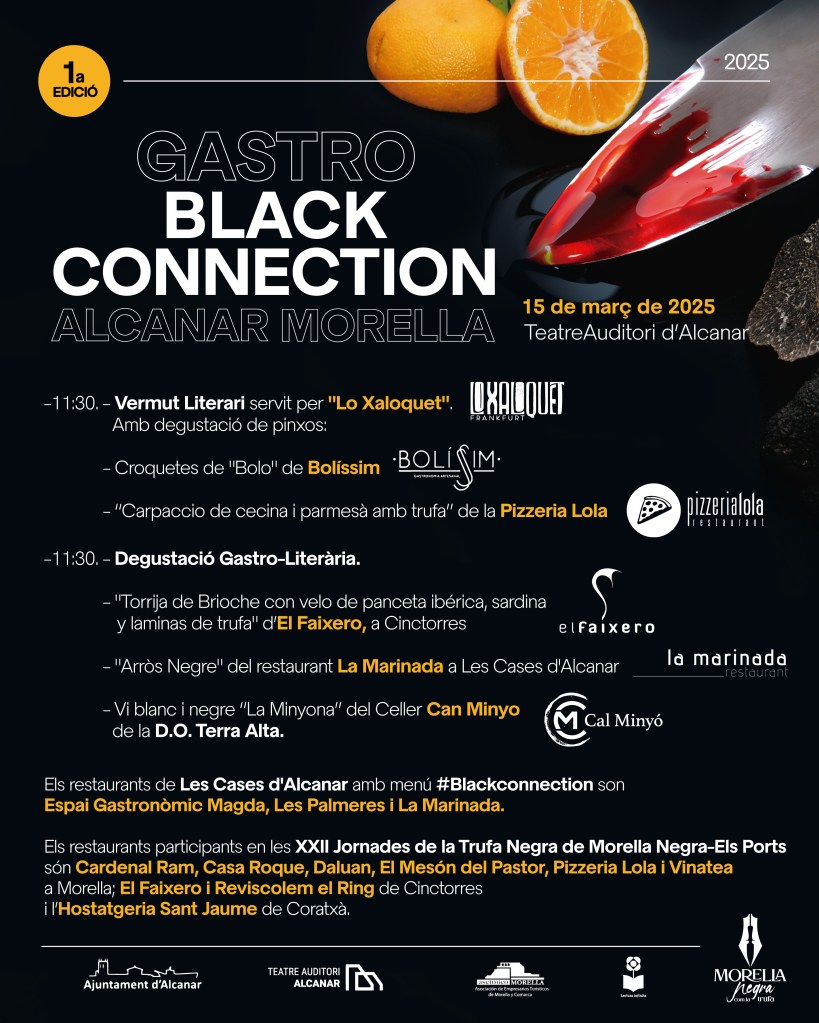 A l’Alcanar-Morella Blackconnetion, com a Morella Negra Com la Trufa a l’acabar cada grup de taules ens espera un Vermut Literari o una Degustació Gastro-Literària amb fusió de la cuina d’Els Ports i la del Montsià